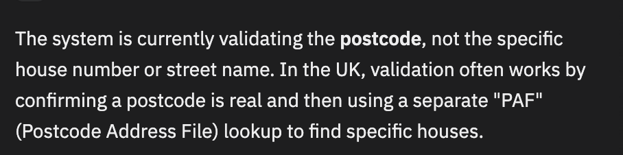 There have been multiple cases in the UK where people have been threatened with legal action over infringements of copyright when using address data. Replit had even suggested I use a service – https://getaddress.io – that recently closed because it lost a court case over third party rights in address data. Silly Replit.